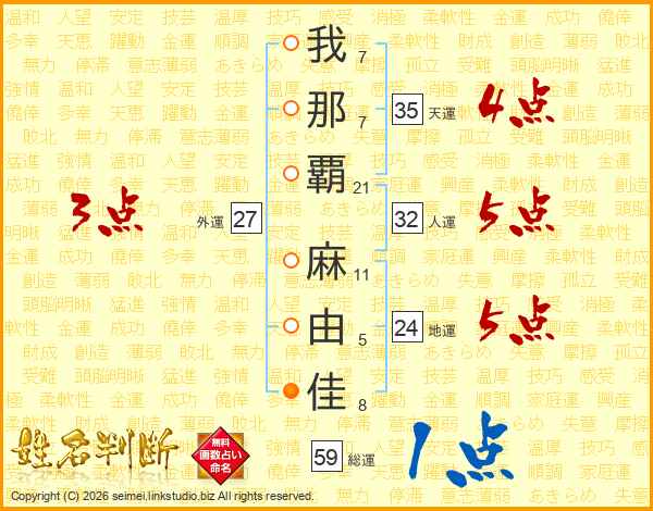 我(7画)那(7画)覇(21画) 麻(11画)由(5画)佳(8画)