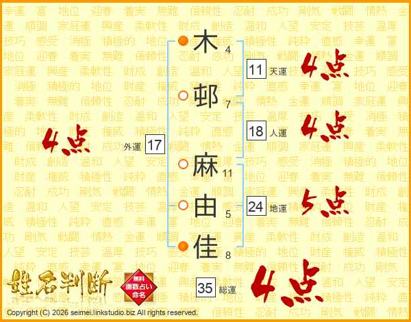 木(4画)邨(7画) 麻(11画)由(5画)佳(8画)