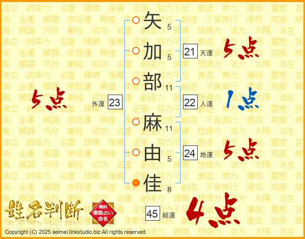 矢(5画)加(5画)部(11画) 麻(11画)由(5画)佳(8画)