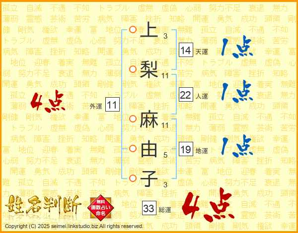 上(3画)梨(11画) 麻(11画)由(5画)子(3画)
