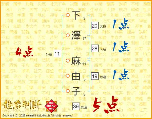 下(3画)澤(17画) 麻(11画)由(5画)子(3画)