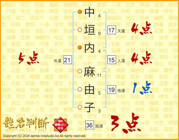 中(4画)垣(9画)内(4画) 麻(11画)由(5画)子(3画)