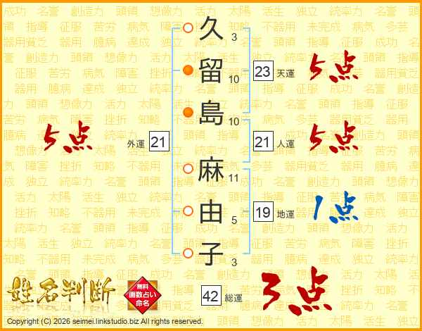 久(3画)留(10画)島(10画) 麻(11画)由(5画)子(3画)