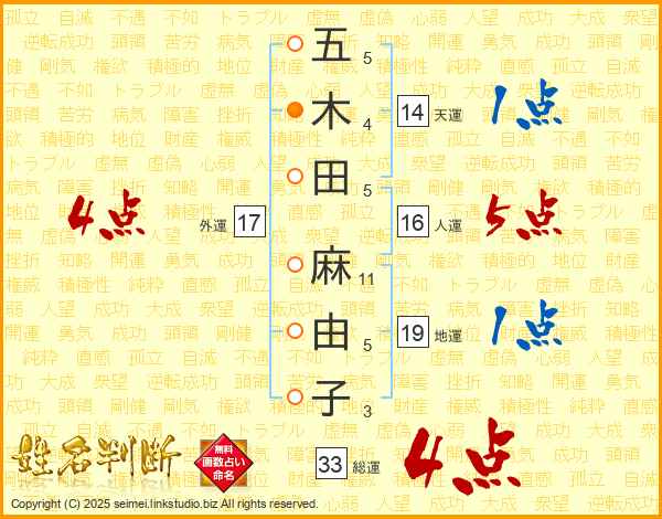 五(5画)木(4画)田(5画) 麻(11画)由(5画)子(3画)