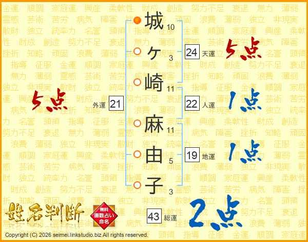 城(10画)ヶ(3画)崎(11画) 麻(11画)由(5画)子(3画)