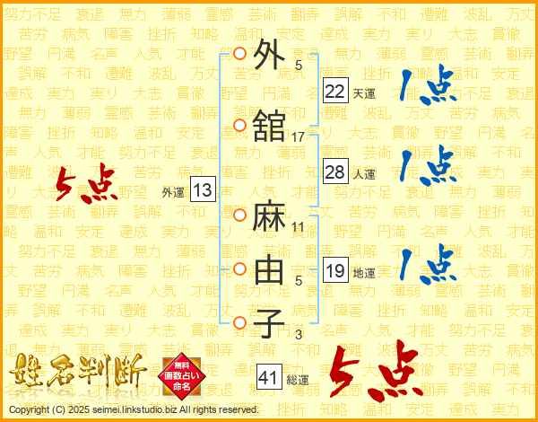 外(5画)舘(17画) 麻(11画)由(5画)子(3画)