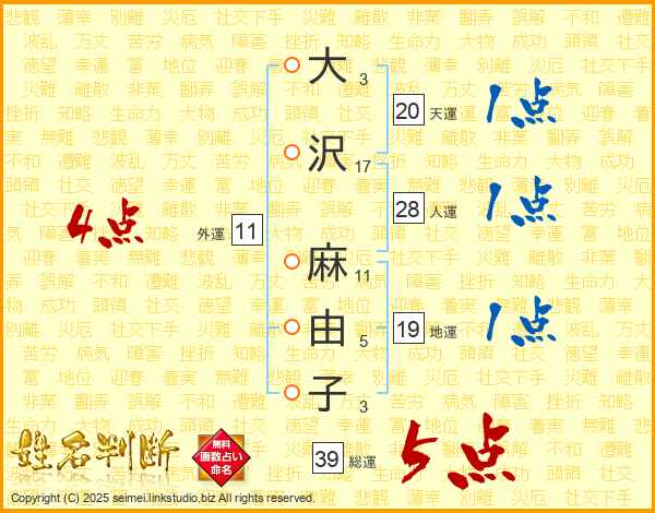 大(3画)沢(17画) 麻(11画)由(5画)子(3画)