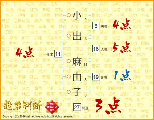 小(3画)出(5画) 麻(11画)由(5画)子(3画)