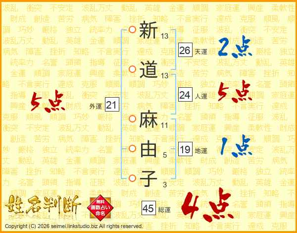新(13画)道(13画) 麻(11画)由(5画)子(3画)