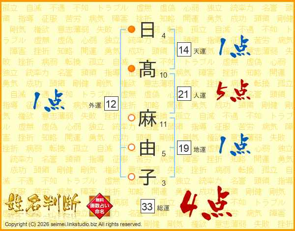 日(4画)髙(10画) 麻(11画)由(5画)子(3画)