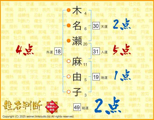 木(4画)名(6画)瀬(20画) 麻(11画)由(5画)子(3画)