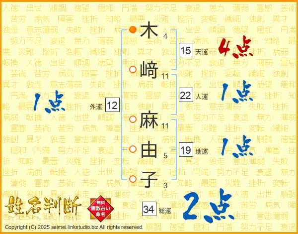 木(4画)﨑(11画) 麻(11画)由(5画)子(3画)