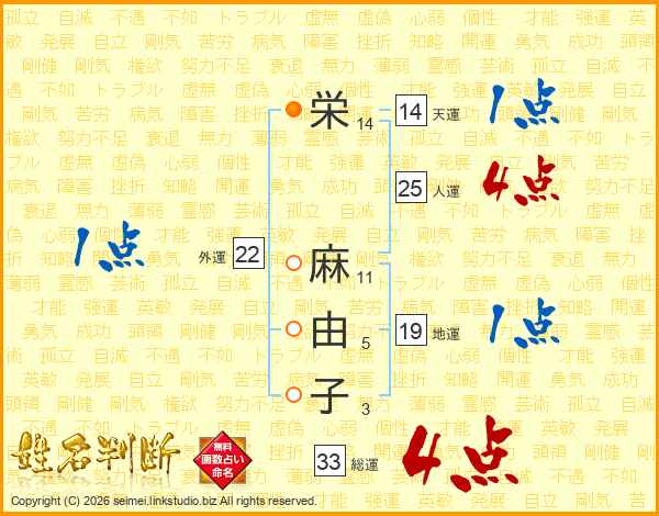 栄(14画) 麻(11画)由(5画)子(3画)