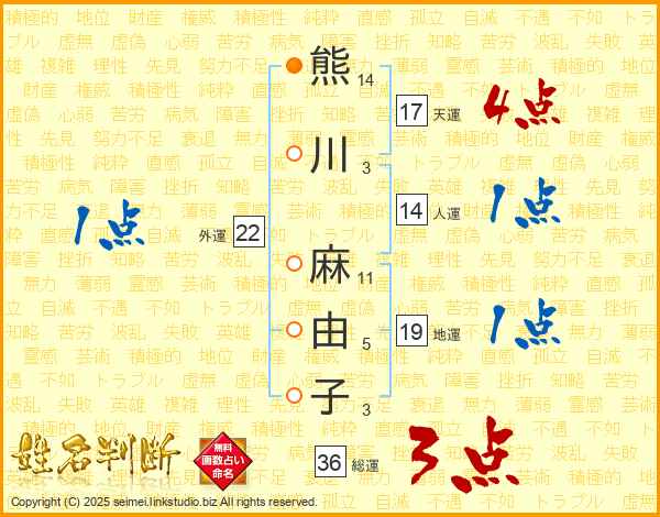 熊(14画)川(3画) 麻(11画)由(5画)子(3画)