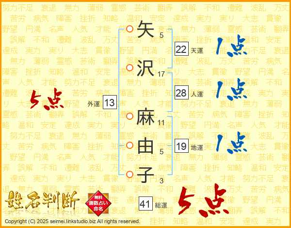 矢(5画)沢(17画) 麻(11画)由(5画)子(3画)