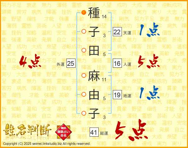 種(14画)子(3画)田(5画) 麻(11画)由(5画)子(3画)