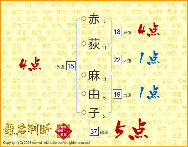 赤荻麻由子さんの総運は37画の5点!