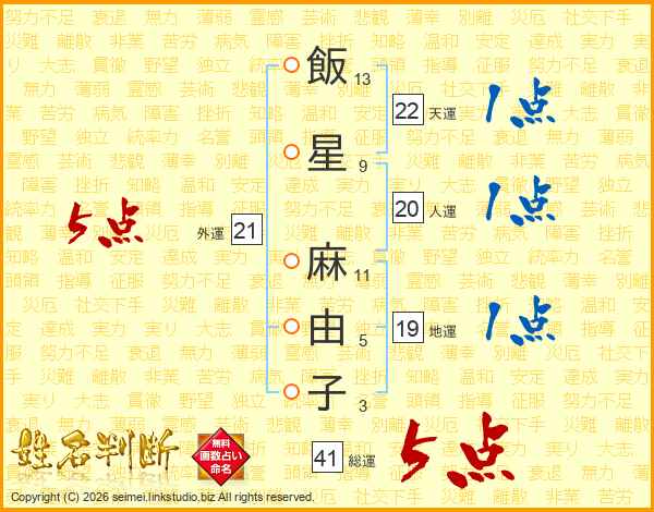 飯(13画)星(9画) 麻(11画)由(5画)子(3画)