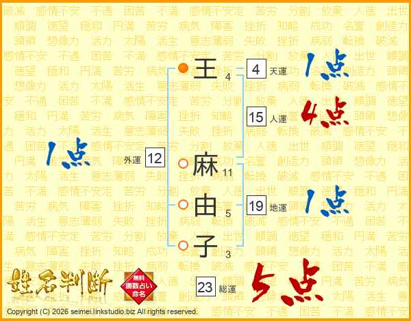 生活面を象徴する運勢です。外部から受ける影響力を表し、結婚運、家庭運や職場、環境への順応性を表します。総運から人運を引いた画数。姓や名が1文字の場合を除く。