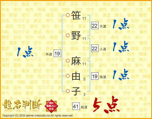 笹野麻由子さんの総運は41画の5点!