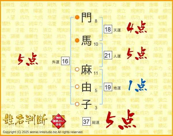 門(8画)馬(10画) 麻(11画)由(5画)子(3画)