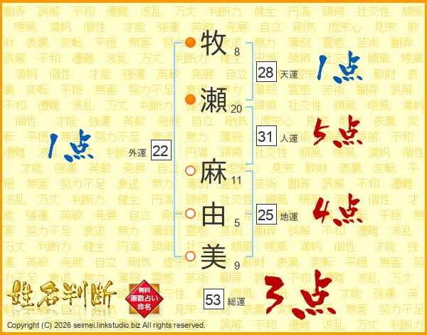 牧(8画)瀬(20画) 麻(11画)由(5画)美(9画)