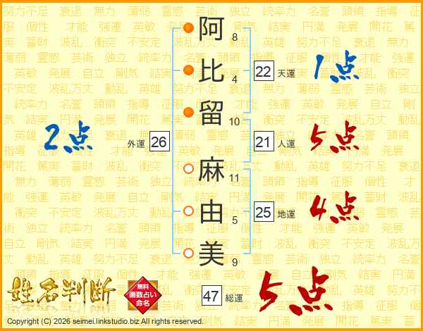 阿(8画)比(4画)留(10画) 麻(11画)由(5画)美(9画)