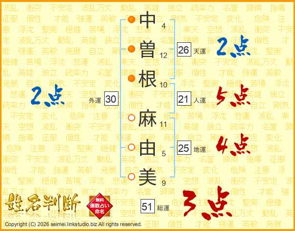 中(4画)曽(12画)根(10画) 麻(11画)由(5画)美(9画)