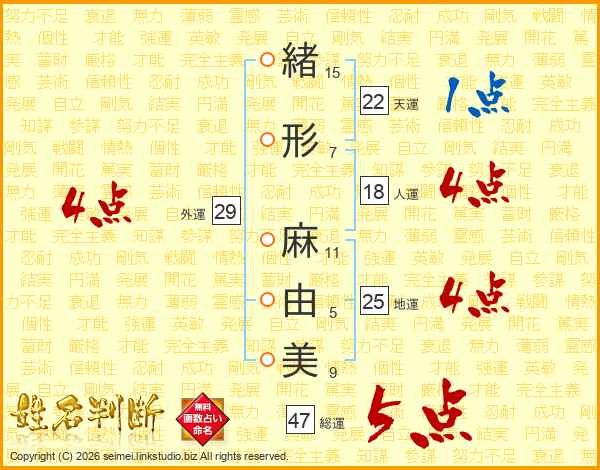 緒形麻由美さんの総運は47画の5点!