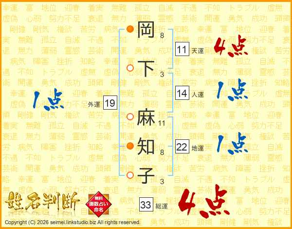 岡下麻知子さんの総運は33画の4点!