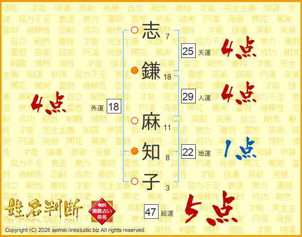志鎌麻知子さんの総運は47画の5点!
