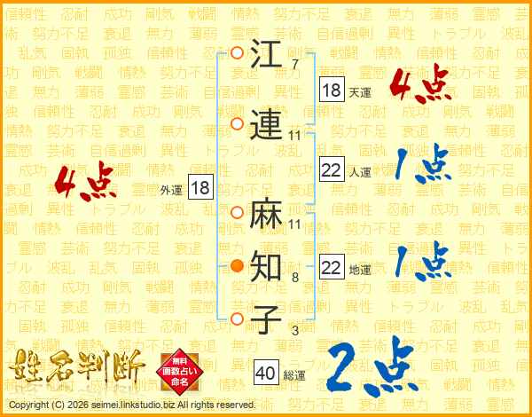 江(7画)連(11画) 麻(11画)知(8画)子(3画)