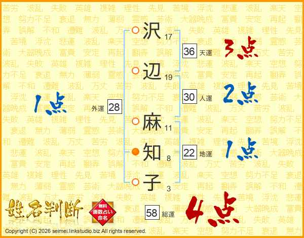沢(17画)辺(19画) 麻(11画)知(8画)子(3画)