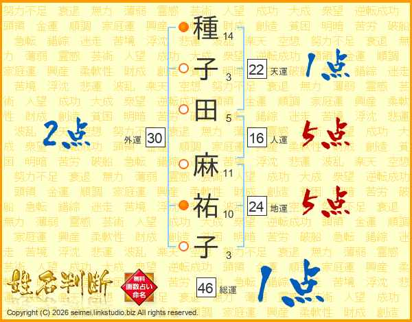 種(14画)子(3画)田(5画) 麻(11画)祐(10画)子(3画)