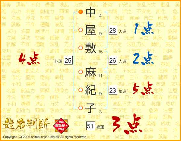 中(4画)屋(9画)敷(15画) 麻(11画)紀(9画)子(3画)