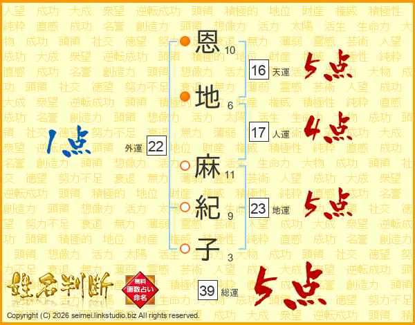 恩(10画)地(6画) 麻(11画)紀(9画)子(3画)