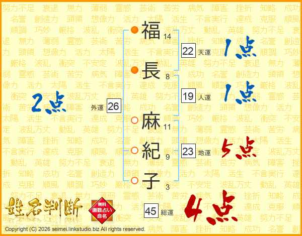 福(14画)長(8画) 麻(11画)紀(9画)子(3画)