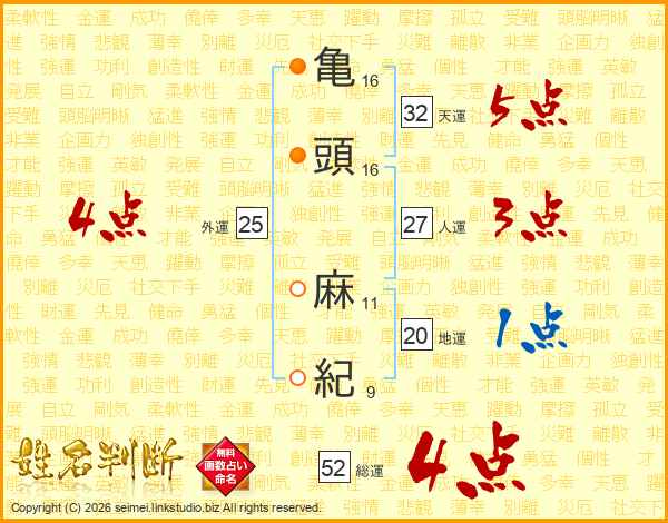 亀(16画)頭(16画) 麻(11画)紀(9画)