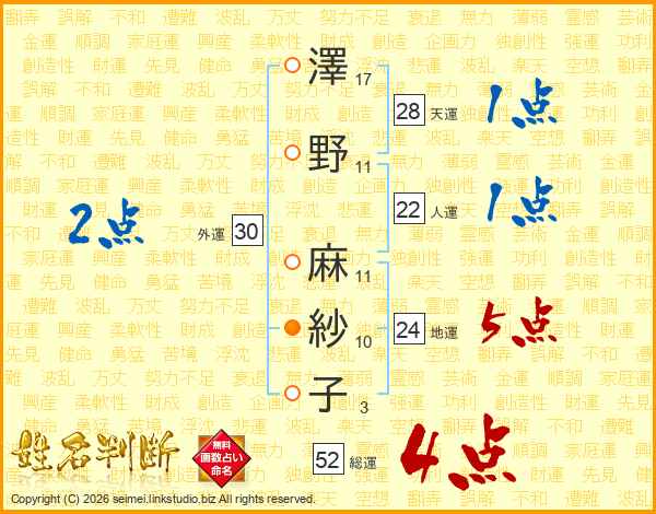 澤(17画)野(11画) 麻(11画)紗(10画)子(3画)