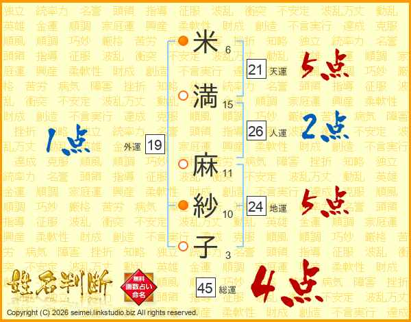 米(6画)満(15画) 麻(11画)紗(10画)子(3画)