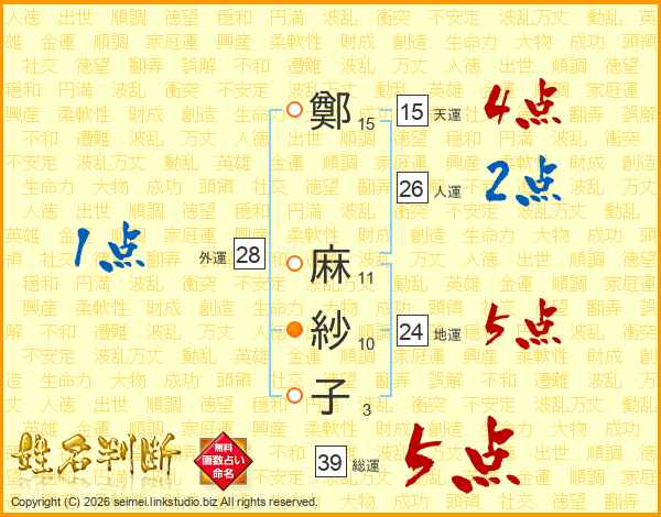 鄭麻紗子さんの総運は39画の5点!