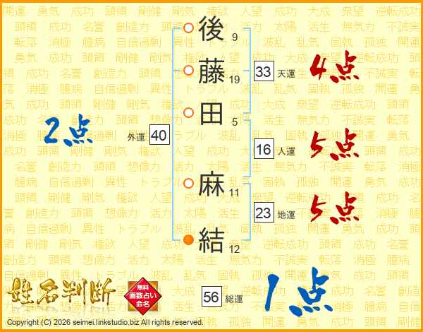 後(9画)藤(19画)田(5画) 麻(11画)結(12画)