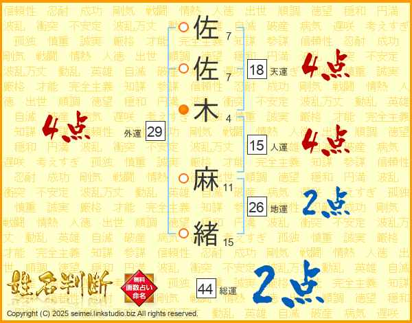 佐(7画)佐(7画)木(4画) 麻(11画)緒(15画)