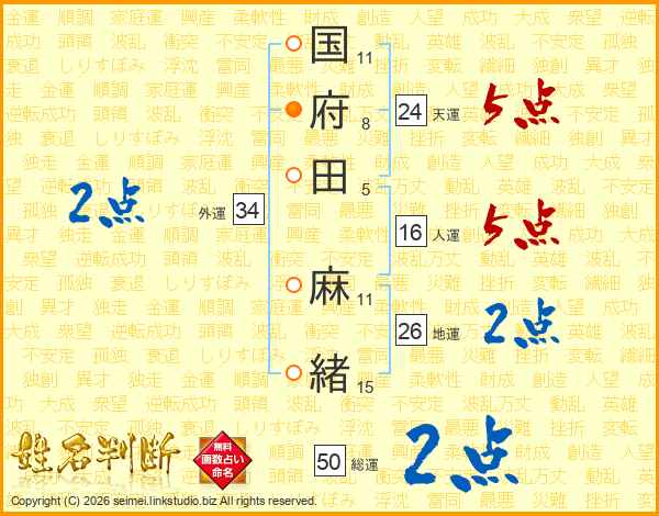 国(11画)府(8画)田(5画) 麻(11画)緒(15画)