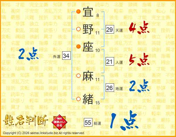 宜(8画)野(11画)座(10画) 麻(11画)緒(15画)