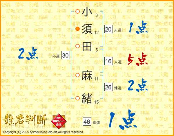 小(3画)須(12画)田(5画) 麻(11画)緒(15画)
