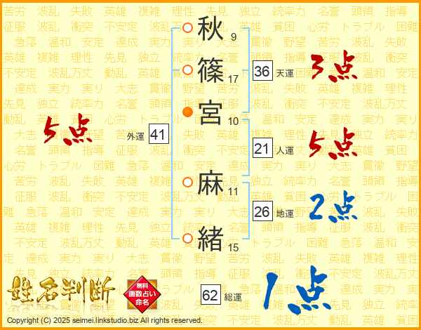 秋(9画)篠(17画)宮(10画) 麻(11画)緒(15画)