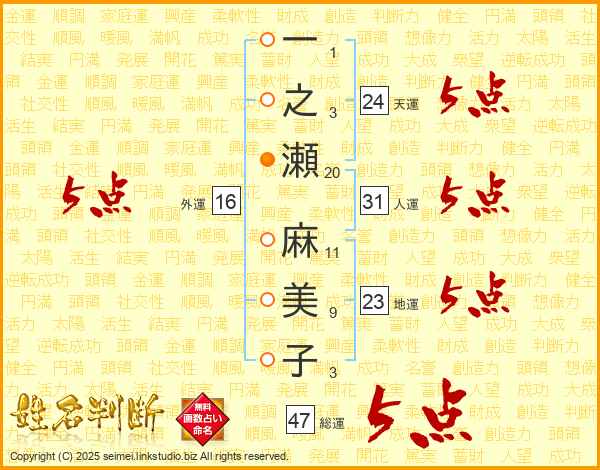 一(1画)之(3画)瀬(20画) 麻(11画)美(9画)子(3画)