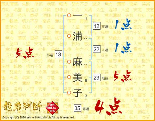 一(1画)浦(11画) 麻(11画)美(9画)子(3画)