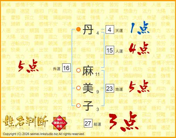 丹(4画) 麻(11画)美(9画)子(3画)